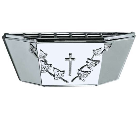 Jardinera para lápidas de nicho elaborado en chapa de acero inoxidable con aplique de hiedras y cruz en relieve.