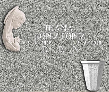 Decoración* de lápida de nicho con Virgen Niña y jarrón de marmolina. Inscripción grabada y pintada en negro.